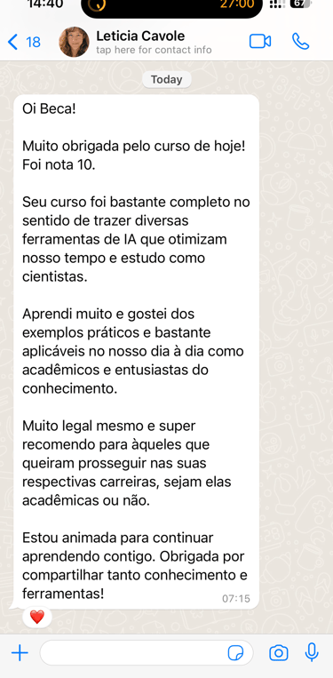 O aprendizado não para na aula! Ao se inscrever, você terá acesso à gravação do curso e atualizações exclusivas, garantindo que estará sempre alinhado às inovações no uso de IA na ciência.
